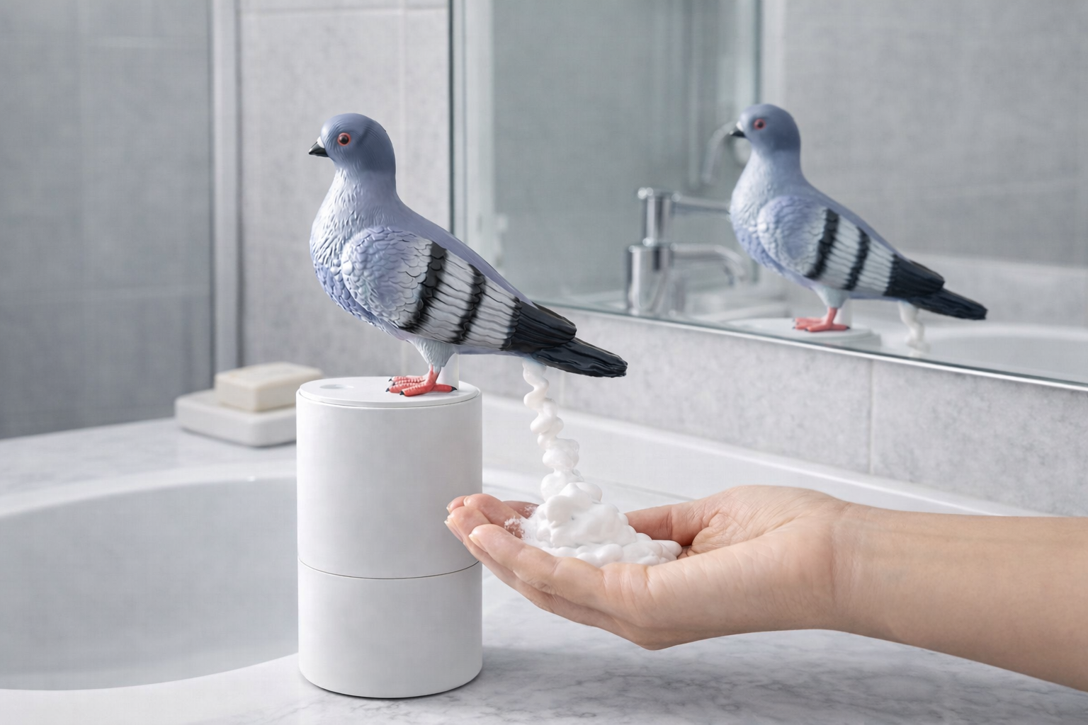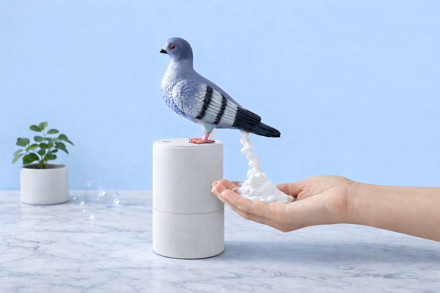 Guaranteed conversation starter. Everyone will ask “WHAT is that?!” — then immediately try it. Touchless foaming soap with the funniest pigeon gimmick.